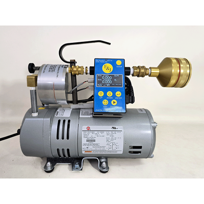 The Model DF-1E-2G portable air sampling system with a digital flowmeter is a low-volume air sampler consisting of oilless, carbon vane vacuum pump, with a mechanical constant air flow regulator for use where a nearly constant air flow is desirable. The regulator holds a constant pressure drop across an in-line orifice by varying the flow through a bypass valve into the pump. This system allows the pump to work at a minimum pressure drop at all times, permitting it to run cooler, thus extending its service life. The oilless pump requires no lubrication to maintain optimal efficiency during its service life. The pump is mounted on a base with four rubber feet. A handle is provided on the chassis to facilitate transportation.