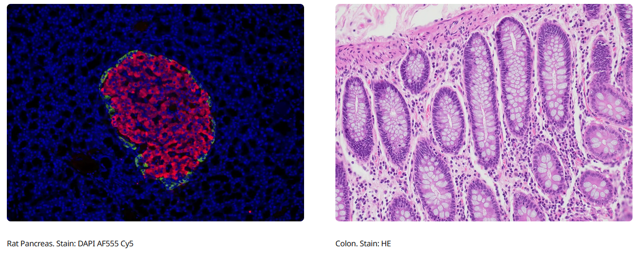 The DP75 camera supports multiple staining combinations and wavelengths up to 1000 nm with a switchable infrared (IR) cut filter. This setup enables you to—for example—check your sample conditions with your standard widefield microscope before spending time on a confocal microscope to finalize your imaging.