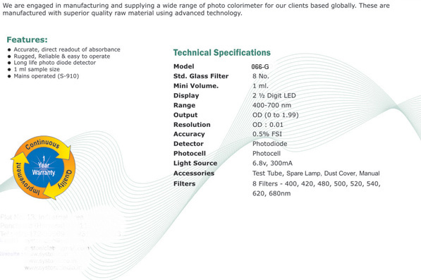A minimum sample volume of 1 ml. is required to carry out the analysis. Provision has been made to switch-on the lamp source only when required, thereby increasing the life of the photo diode. This Digital Photo Colorimeter is extremely useful for quantitative estimation of several chemical substances including blood chemistries in chemical/clinical laboratories, pharmaceutical industries, medicine plants, water treatment plants, agriculture universities, etc.