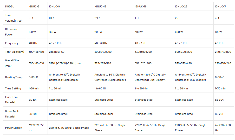 Continuous Self Tuning Circuitry for any change in Workload, Liquid Level and Bath Temperature. Uniform Cavitations throughout the tank with Special Transducers. Separate Oscillator eliminates damage to generator, in case of failure of transducers. Using 40 kHz Frequency for Effective Cleaning with Low Noise. Designed for complete cleaning of small and large components without dismantling. Inner tank and Outer body made up of Stainless Steel.