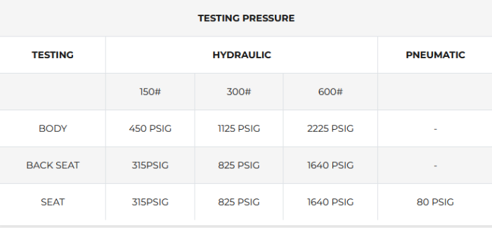Technical Data: Manufacturing Std : API 600. Face to Face, End to End : ASME B16.10. End Connection : Flanged Ends to ASME B16.5, RF. End Connection : Butt Weld Ends to ASME B16.25. Inspection and Testing Std : API 598 TEST PRESSURE.