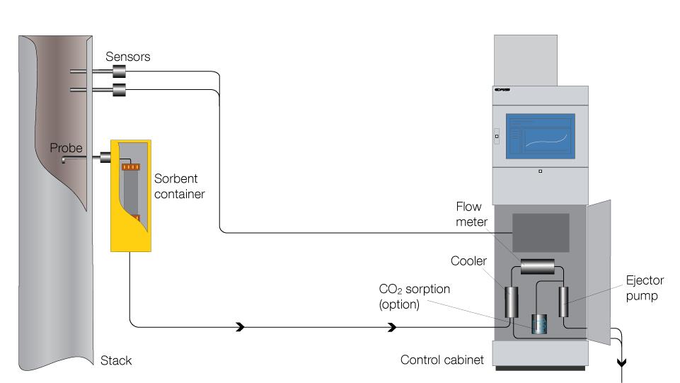 The sampling system is also available in a variant for CO2 sampling only called CO200. Function and appearance are similar to the DX100, but the CO200 is equipped only with a flow-proportional sampler for CO2. CO200 can subsequently be expanded to a complete DX100 system, which then also includes isokinetic sampling of dioxins.