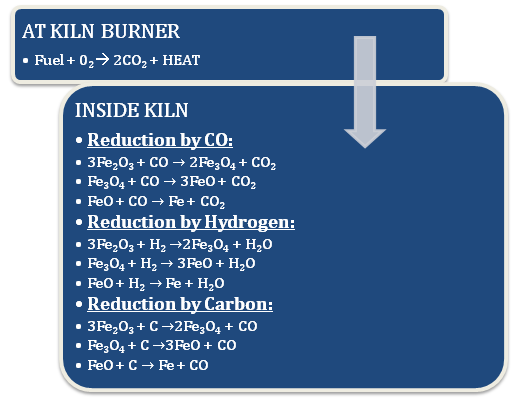 Iron Ore Fines and Coal Fines mixed together are loaded into SiC (Silicon Carbide) beakers which are then loaded onto the cars. The cars are made to pass through the Tunnel kiln. The material goes through a series of Chemical Changes owing to the temperature and pressures of the kiln. The oxides of iron are reduced to iron as per the above reactions.