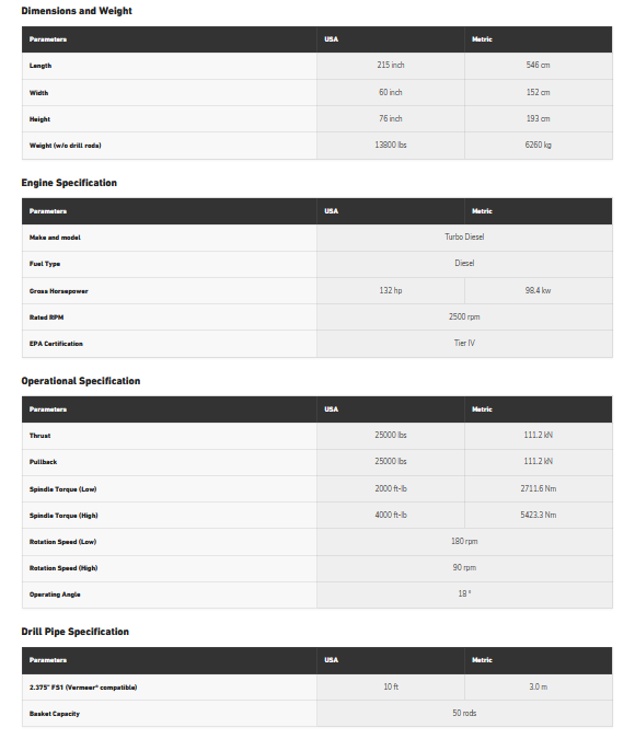 Push/Pull: 25000 lbs. Torque: 4000 ft-lb. Engine: 132 hp. Mud Pump: 72.9 gpm.