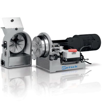 In the DM 200 the feed material enters the dust proof chamber from the filling hopper and is fed centrally between two vertical grinding discs. A moving grinding disc rotates against a fixed one and draws in the feed material. The necessary comminution effects are generated by pressure and frictional forces. The progressively arranged grinding disc meshing first subjects the sample to preliminary crushing; centrifugal force then moves it to the outer regions of the grinding discs where fine comminution takes place. The processed sample exits through the grinding gap and is collected in a receiver. The gap width between the grinding discs is continuously adjustable and can be adjusted during operation in the range between 0.1 and 5 mm; an additional observation window is provided for checking the gap setting.