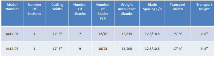 The 4412 is available in five or seven shank models. The tools are equipped with Auto-Reset shanks with 3500 pound point load shanks positioned on the frame for maximum residue flow. Working to a depth of eighteen inches the 4412 can shatter deep hardpan and equip it with the H.D. coil tine harrow option to leave the soil nearer to seedbed conditions.