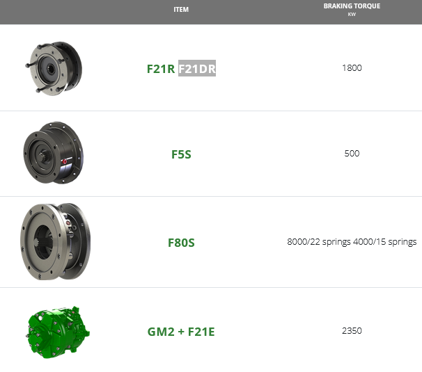 Handbrakes and emergency brakes with hydraulic control (negative, multi disc in oil) with output shaft, that can be applied to the motor.