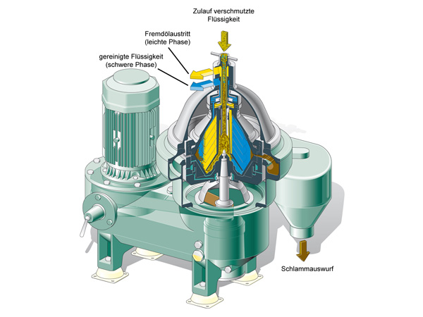 Separator-system : Self-discharge disk separator 3-phase-separation, Separator parts in contact with the medium are of stainless steel