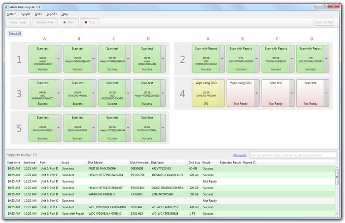 Maximum number of Recycler units in one network is 200. Each unit has 4 ports, which means you can control up to 800 ports simultaneously with only one Disk Recycler software instance. Recycler system is specifically designed to function with large number of hard disk drives in one network. All ports are completely independent, and failure of one or more hard drives has no impact on other ports. You can even assign completely different tasks to each port in the network, and all tasks will still run simultaneously without affecting each other in any way. Recycler provides high speeds of up to 18 GB/min, ensuring the highest level of efficiency.