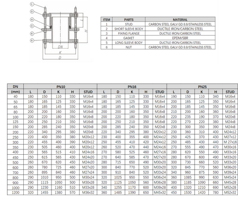 Dismantling Joint: Body: Ductile Iron GGG50, Galvanized steel grade 8.8 bolts and nuts, Fusion-bonded epoxy coating min 250 micron. Flange drilling EN1092-2 PN10/16/PN25/PN40