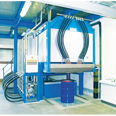 - Stand alone unit for tinting of pre-filled cans/movable vessels with base material or integrated in an external tank park with base materials
