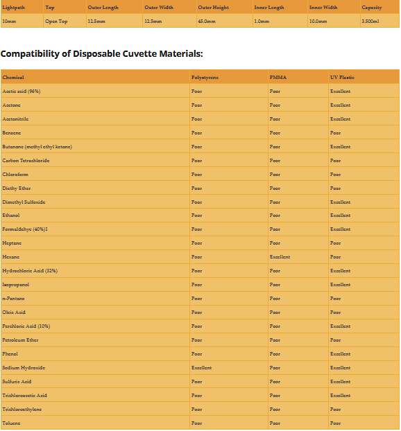 Standard macro disposable cuvette box of 100.Lightpath: 10mm.