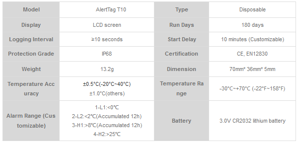 The AlertTag T10 LCD Disposable Temperature Monitor/Indicator is cost-effective, lasts up to 180 working days, and has a 2-year shelf life. The temperature monitoring accuracy is within ±0.5°C. There are different models for customers to choose, 7 days, 15 days, 30 days, 60 days, 90 days, 120 days or even 180 days.