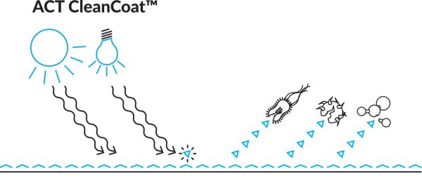 In the presence of indoor or outdoor light, ACT CleanCoat™ uses Titanium dioxide (TiO₂) to turn natural humidity and oxygen into free radicals in a natural process called photocatalysis.