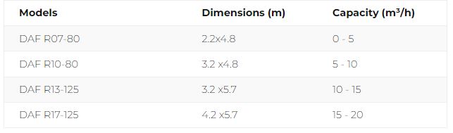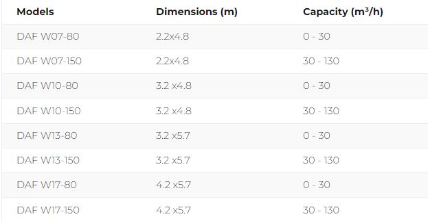 Fluence produces lines of DAF units for both processing wastewater and thickening digestate. The compact units range in capacity from up to 30 m³/h to 130 m³/h for wastewater treatment, and from up to 5 m³/h to 20 m³/h for digestate thickening.