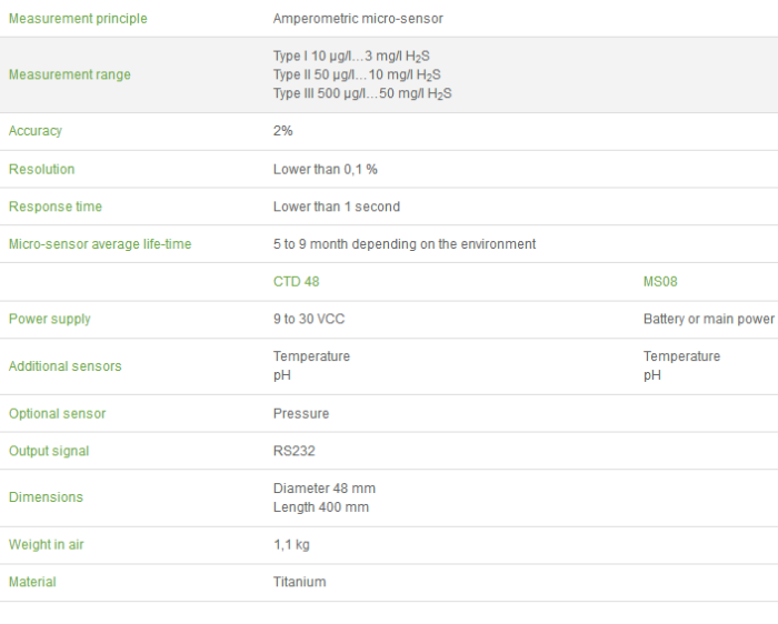 - The CTD48 system, stronger, for a continuous use in water: the probe contains in the head several sensors that allow concentration calculation. The titanium protection cage includes then a H2S amperometric micro-sensor, a pH sensor, a temperature sensor and can also hold a pressure sensor. Measurement data are operated through electronic embedded in the probe’s body. A CTD48M version that records data is also available.