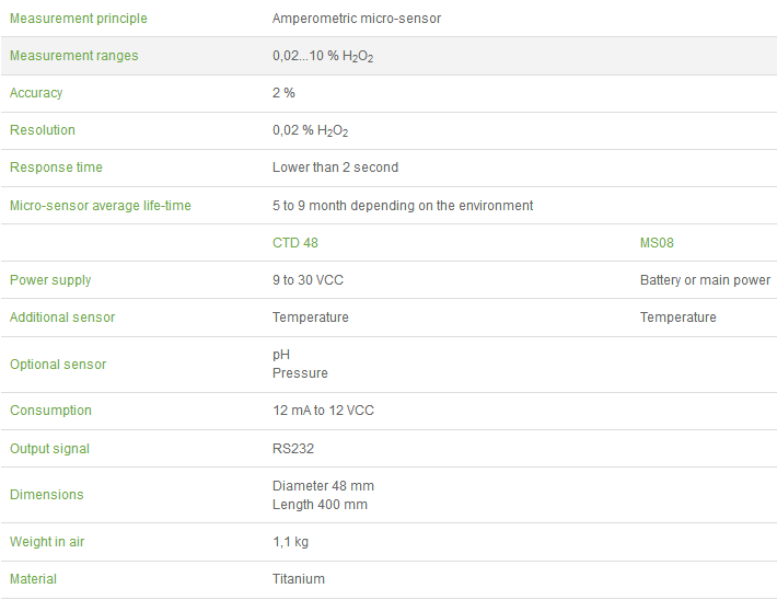 - The CTD48 system for an online application in the environment. The probe contains several sensors in the head. The titanium protection cage integrates a H2O2 amperometric micro-sensor, a pH sensor and a temperature sensor. It can also contain a pressure sensor. Measured data are operated through the embedded electronic in the probe’s body. A CTD48M version that records data is also available.