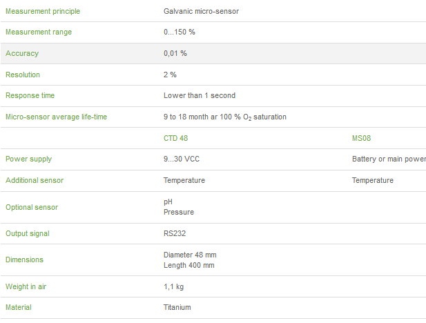 - The CTD48 system for an online application in the environment. The probe contains several measuring sensors in its head. The titanium protection cage integrates the O2 galvanic micro-sensor, a pH sensor and a temperature sensor and can also contain a pressure sensor. The measuring data are processed through the embedded electronic in the probe’s body. A CTD48M version is also available for data recording.