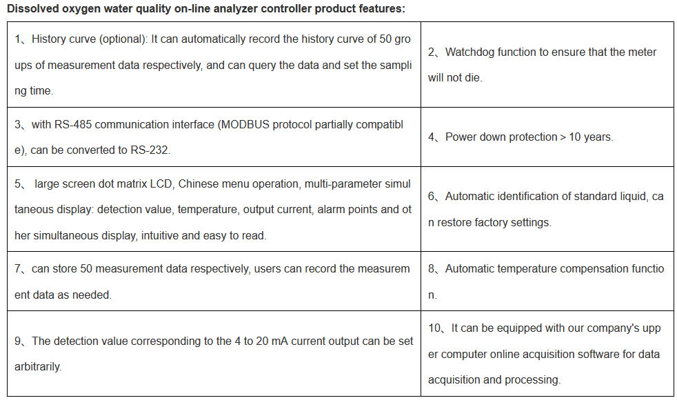 Online dissolved oxygen meter is an online intelligent dissolved oxygen detector produced by our company by introducing foreign technology, adopting imported components and dissolved oxygen membrane head, based on polarographic analysis technology, and advanced production process and surface paste technology.The use of this series of advanced analytical techniques ensures that the instrument works stably, reliably and accurately for a long period of time. With Chinese menu operation, notepad storage of measurement data, 485 communication and other functions.Widely used in continuous monitoring of dissolved oxygen value in solution of chemical fertilizer, metallurgy, environmental protection water treatment engineering, pharmacy, biochemistry, food, breeding and tap water.