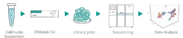 Starting with liquid cell suspension, the DNBelab C4 will encapsulate single cells within liquid droplets, cell lysis and mRNA capture by designed beads, followed by efficient demulsification recovery of beads, reverse transcription, cDNA synthesis, and followed by high- throughput library preparation, sequencing, and data analysis.