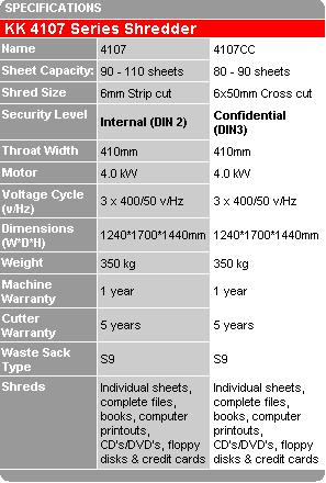 The KK 4107 and KK 4107CC are High performance Strip or Cross Cut Large Document Shredders with sophisticated conveyor feeding belt and special paddles to shred large quantities of sensitive waste including crumpled paper.
