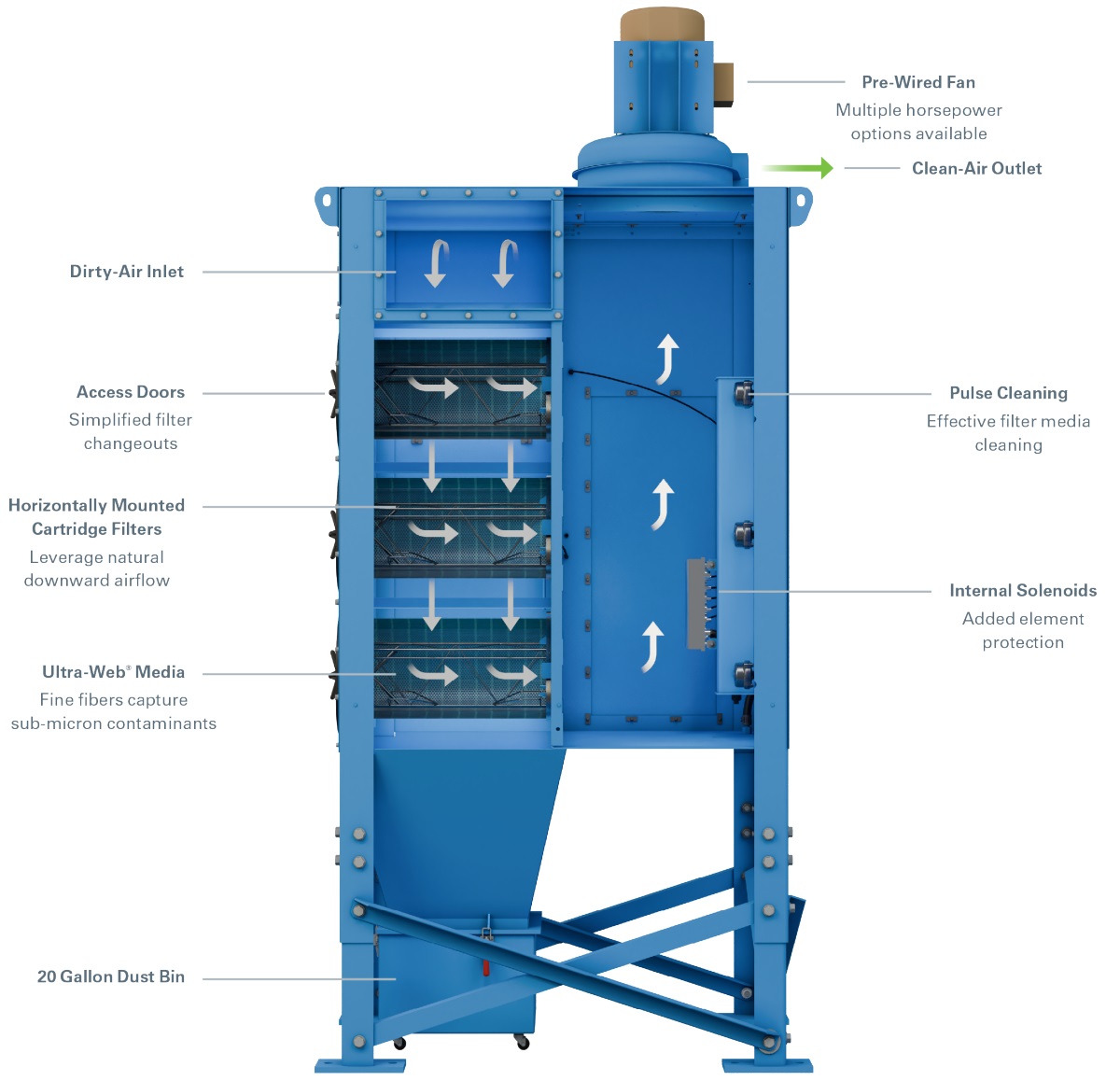 The unit’s pre-wired fan and controls help take you from installation to operation fast, while the timely pulse cleaning adds to filter life and performance.