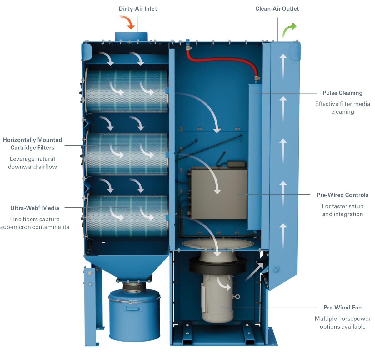 Features include: Multiple integrated fan options to tailor the operating airflow and static pressure to your unique process needs. Side-mounted explosion vents or flameless vents to provide a complete and robust package for a variety of combustible dust applications. 15-gallon Sealed Drum Kit offers a simple and cost-effective solution for combustible dust applications.