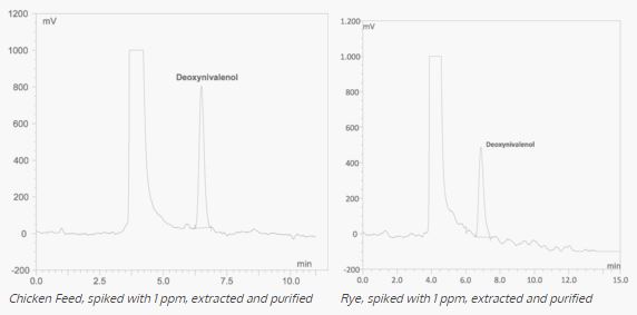 The material within the columns is retaining matrix components and interfering substances, whereas the toxin flows through. Deoxynivalenol and Nivalenol are passing the column with the same efficiency. The column bed consists of a dry material. It has no special requirements for storage.