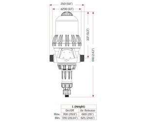 Product Code: 28080200000. Name: MixRite TF-10. Material: PP+FG. Thread Type: NPT. Color: Grey. Working Pressure: 1–8 bar. Thread Size: 1 1/2″. Water Pressure: 1–8 bar [14.5 to 116 psi]. Dimensions: 13.3″ × 45.1″. Weight: 16.3 pound [7.39 kg]. Min Pressure Loss: 1 bar. Max Pressure Loss: 8 bar. ON OFF System: No [Air Release]. Air Release: Yes. Chemical Bypass: Standard. Dosage Rate: 0.2%–2%. Chemical Resistance: Standard. With Legs: Optional. Foot Valve: Optional. Connection Type: Threaded. Min Injection Per Hour: 0.1 l/h [0.026 gph]. Max Injection Per Hour: 200 l/h [53 gph]. Flow Rate Range: 50–10000 l/h [0.2 to 45 gpm].