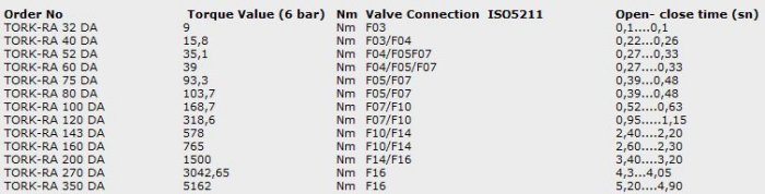 Application : Ball Valve, Butterfly Valve, Plug Valve, Dampers on-off / proportional control. Size : RA 32 DA … RA 350 DA. Supply Pressure Air : 4 - 8 bar. Output Tork Value : 9 Nm … 5162 Nm. Body : Extruded Aluminium / Cast Aluminium. Caps and Pistons : Die cast Aluminium. Temperature : .-10ºC … 80ºC. Valve Connection : ISO 5211 / DIN3337 standard. Limit Switch Connection : Namur standard, VDI / VDE3845. Positioner Connection : Namur standard, VDI / VDE3845. Solenoid Valve Connection : Namur standard, VDI / VDE3845. Stroke Adjustment : Both directions open and close positions ( ±5%). Change to Single Acting : Add springs.