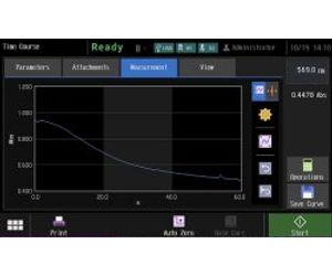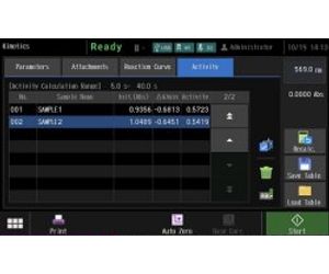 Measures absorbance changes as a function of time, and obtains the enzymatic activity values. The kinetics measurement method or the rate measurement method can be selected.