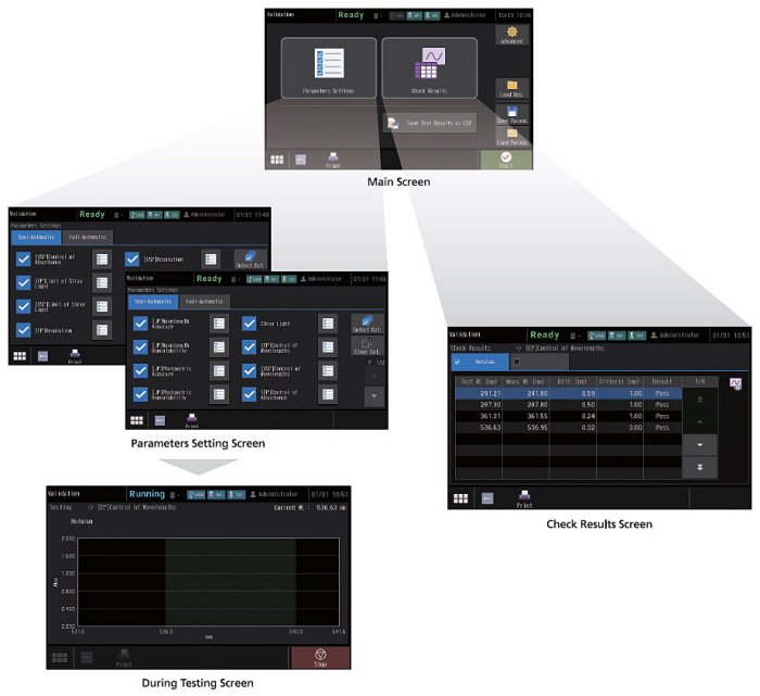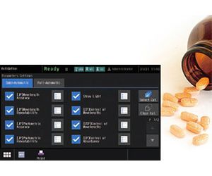 This instrument can not only run checks for nine JIS items, but also those stipulated in the Japanese Pharmacopoeia (JP), United States Pharmacopeia (USP), and the European Pharmacopoeia (EP). Naturally, the hardware is also compliant with the specifications required by each Pharmacopeia. In addition, the check conditions can be saved. As a result, once the conditions are saved, checks can be performed easily just by calling them up as needed. Check results can also be saved.