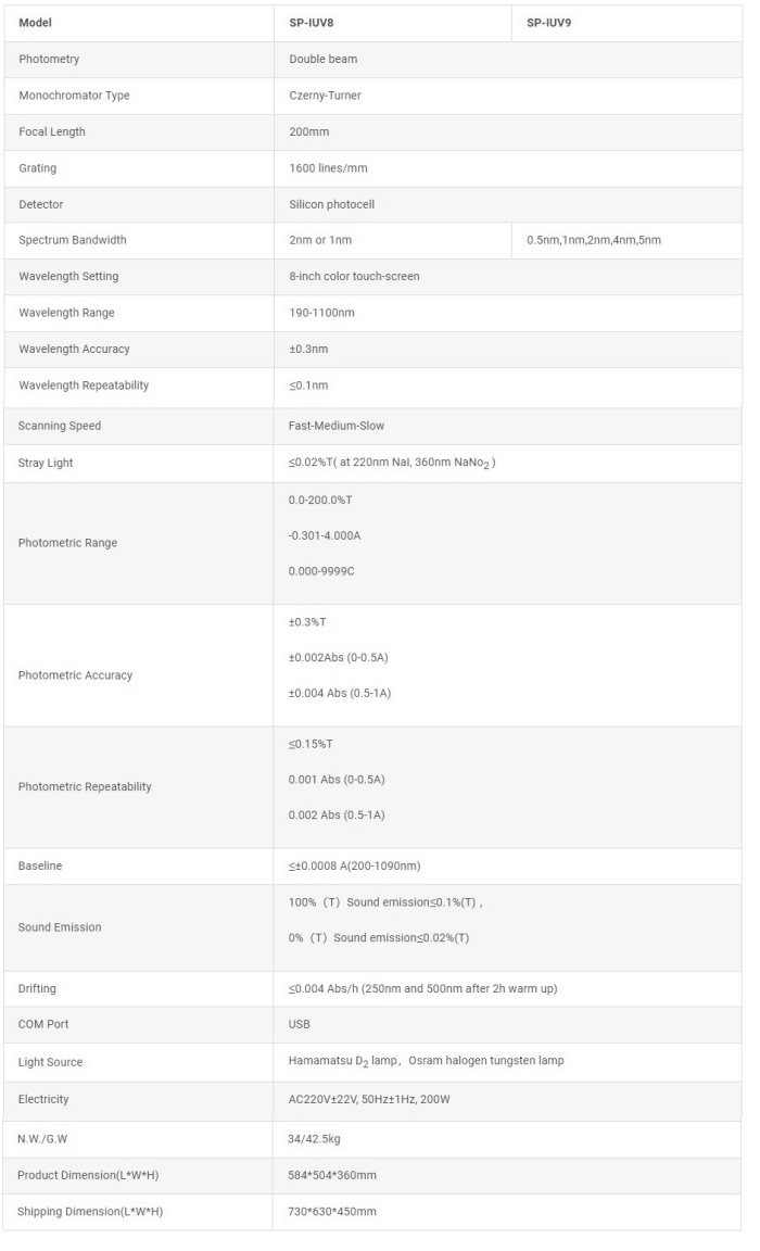 SP-IUV8 and SP–IUV9 Double Beam UV Visible Spectrophotometer serve as the basic equipment for quality control, technical evaluation and scientific research, and can be widely used in susceptibility testing, medicine and health, biochemistry, environmental monitoring, commodity inspection, petrochemical and other fields.