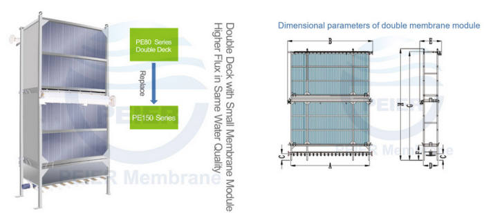 The suction pipe diameter of pel50-200-2s (double-layer) membrane module is DN50. and the suction pipe diameter of pe!50-100-2s (double-layer) and pe150-150-2s (double-layer) membrane module is Dn40.
