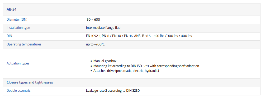 The Jasta AB-54 with double eccentric disc is used both as a shut-off valve (leakage rate 2 according to DIN 3230) and as a throttling valve for liquid and gaseous media.