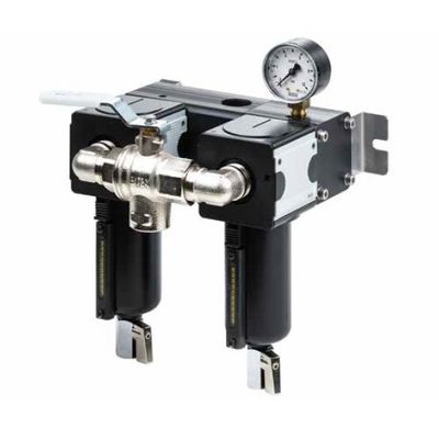 Compact construction, including parallel filters and three-way valve with one hand lever, facilitates easy on-line filter element change and secures trouble-free compressed air supply. There are three filtration level options 1, 3 and 5 microns.