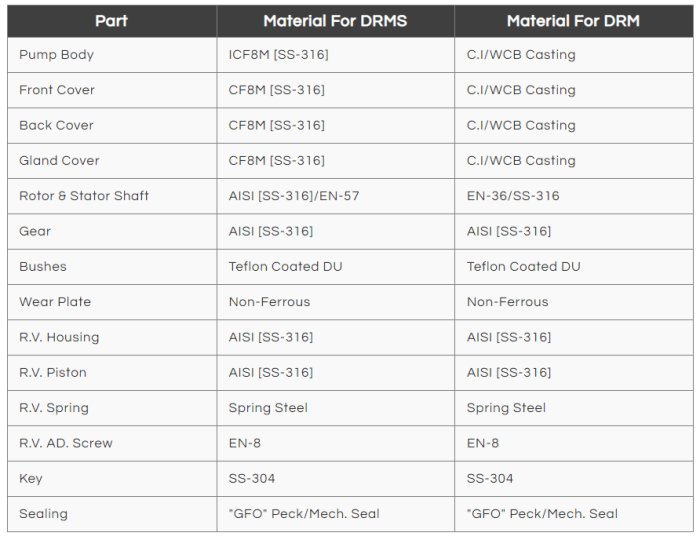 DRMS Pump Having All Stainless Steel In Four Piece Construction With Investment cast. Due To Four Piece Construction It Can Be easy To Clean And Maintain. DRMS Pump having A Double Helical Refined S S 316 Gear Shaft That Are Nitraded To Give Longer Life. Due To Double helical Helical gear It prevent Axial And Side Thrust Which Help To Increase Life And Performance Of Pump.The Teflon Coated Dry Running DU Bush Bearing Supported On Bronze Wearing Plate , placed inside The Pump Casing Alternatively Bronze Wearing Plate Cum Bushes Can Also Be Provided For Thicker Viscous Liquid Application.