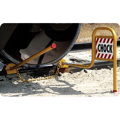 - All steel construction railcar wheel chocks with replaceable rail biting spur for securing freight cars and locomotives on exposed tracks.