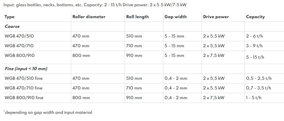 Low energy requirement, long service life and low wear and tear are among industry demands on double roll crushers on top of the optimum comminution curve. Furthermore, double roll crushers crush glass/ cork connections (glass in screw connections or glass around corks), bottlenecks and thick bottle bottoms. Large-size glass-bottle parts are thus turned into even-sized cullet which can be passed on for optical separation in an ideal size.