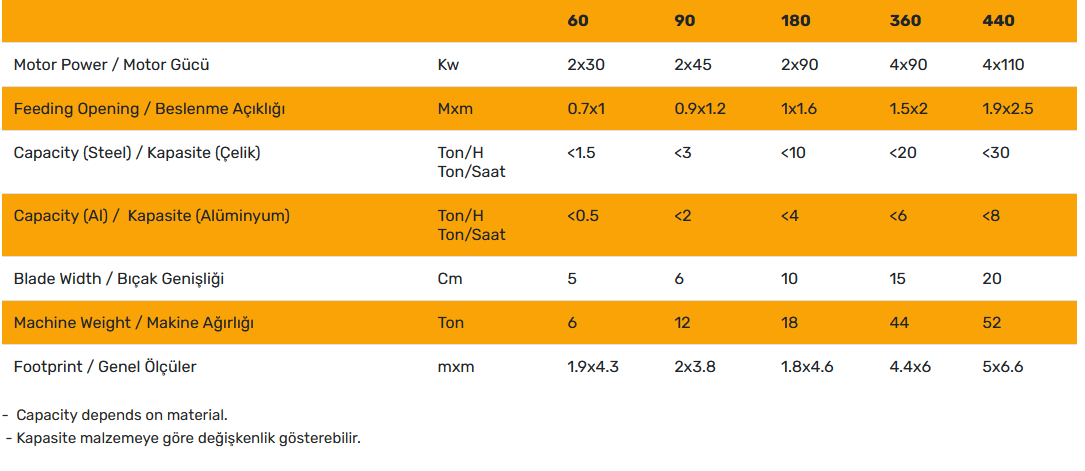 Capacity up to 2 tons per hour for aluminum cans. Automatic operation. Chrome plated & tampered shafts and sensitively honed cylinders. Special anti-wear plates. Relaible filtration system for the hydraulic oil. Relaible cooling system depending on the working climate. Top brand hydraulic and electronic components.