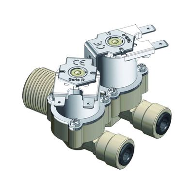 Double R series: 2/2 solenoid valve, dn 10mm, servo-assisted, NC (normally closed), 2 outputs Suitable for use with drinking water. Also available with direct drive and in the NO (normally open) and bistable version. It can be used as an inlet solenoid valve, for water loading.