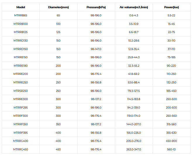 Shangu MTRR series is a two-stage roots blower. A middle cooling system is installed between the first and the second stage blower, which will cool the temperature of airflow out from the first stage blower,and then the temperature of airflow into the second stage blower will be normal and will not damage the blower. By the two stage compression, Shangu MTRR two stage roots blower can reach the maximum pressure of 196KPA.