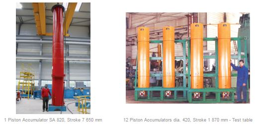 Douce-Hydro also specializes in the design and manufacture of piston accumulators, offering the following technological advantages: high compression ratio, reliability, long term storage capabilities, customs capacity and volume up to very large dimensions, instantaneous high flow rates, adapted to high temperatures, piston functioning reliability, safety, piston position detection (option), can be adapted for transfer systems with non-compatible fluids and easy maintenance.