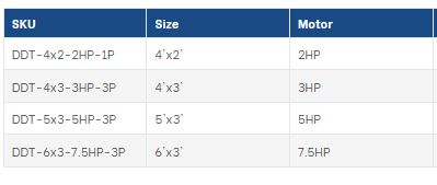 - 4 sizes (4`x2` 2HP, 4`x3` 3HP, 5`x3` 5HP, 6`x3` 7.5HP)