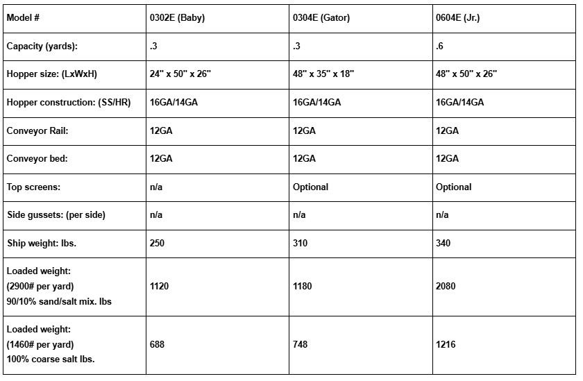 1/2 HP Electric, Stainless motor. 1/2 HP Electric, Stainless motor. 50:1 gearbox reduction @ conveyor. Enclosed motor platform w/ rear venting. 1 1/8″ diameter conveyor shafts w/ 6T cast sprockets. 662 Pintle chain w/ 8500# tensile strength. Greasable, self aligning, drive bearings throughout. Recessed lifting hook & 4 corner tie down points. Third brake light, rubber. Inverted – V deflector on 7′ & 8′ models. Adjustable feed gate w/ salt flap. Formed over rail w/ built in chain shields. Enclosed chute w/ 2 internal, & 3 external, adjustable spreading spring loaded locking rods