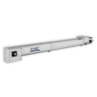 Drag conveyors are designed to convey a high volume of material requiring much smaller amounts of space. Material is moved as a large mass with no internal turbulence, at low speeds. The high capacity and lack of turbulence allows the drag conveyor to handle almost all types of bulk material and can be used to meter or transfer bulk materials from one process to another. The design allows drag conveyors to fit almost any plant layout. Minimal long term maintenance and durability are characteristics of a drag conveyor.