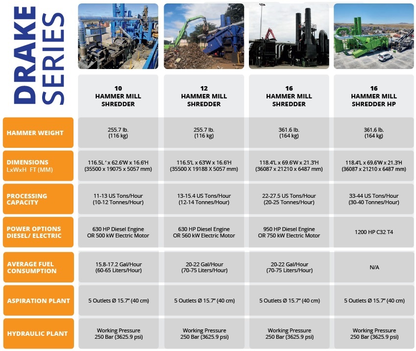 Ing. Bonfiglioli has garnered a global reputation for high-quality recycling processing systems. Compact Drake Hammer Mill Shredder Systems are available in 10, 12, 16 and 16HP model versions with processing capacities ranging from up to 11-13 tons/hour on the Drake 10 model to up to 33-44 tons per hour on the Drake 16HP (High Performance) model. The Drake Hammer Mill Shredders process loose light iron, preprocessed ferrous materials, entire vehicles and even baled vehicle shells.