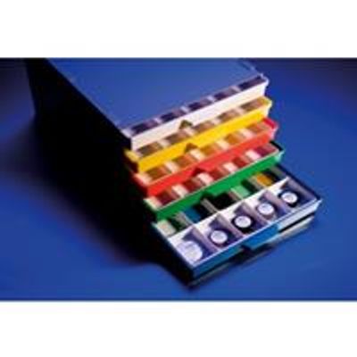 With 5 drawers, each with 25 partitions (total for 125 pellets or beads) with a max. diameter of 42mm. It is important to keep reference materials, prepared as beads or pellets in a dust free and dry environment. There is a wide range of boxes and containers for single or multiple samples and standards for XRF.