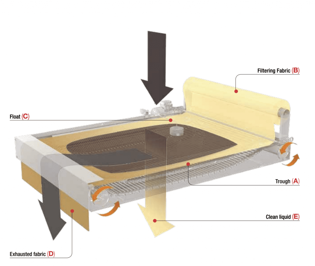 - The dirty coolant falls into the distribution trough (A) and from here onto the filter fabric (B) which retains solid pollutant particles (dust and swarfs) while the filtered oil passes through it.