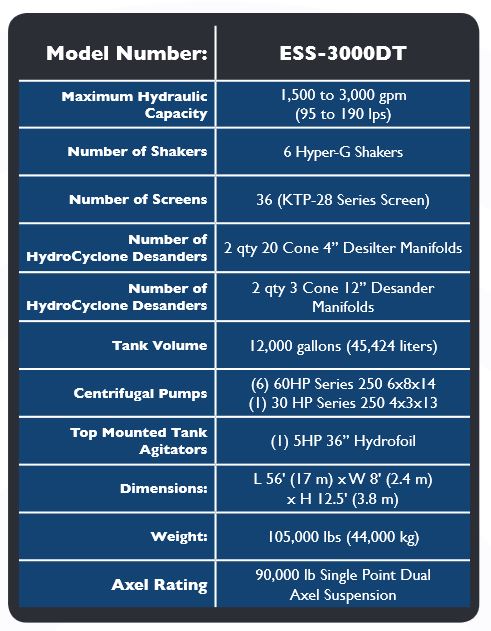 Maximizing Discharged Solids DrynessWhen it comes to dewatering dredge solids, the most valuable asset is screening surface area. No matter how sophisticated a shaker used, unless there is sufficient surface area, the dewatering process will never be maximized.Similar systems will use four (4) or five (5) linear motion shakers. Though this number of shakers may be sufficient, the fact is that competing systems utilized single-deck screens. As such, even with five (5) shakers, these systems rarely achieve more than 160 square feet of screening surface area. Elgin’s ESS-3000DT used six (6) dual-deck providing for an impressive 340 square feet of screening surface area, effectively doubling competing systems.